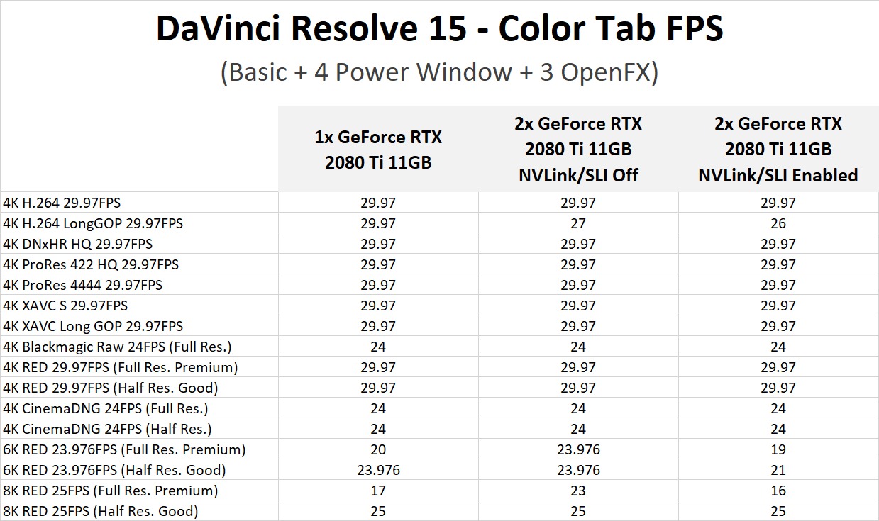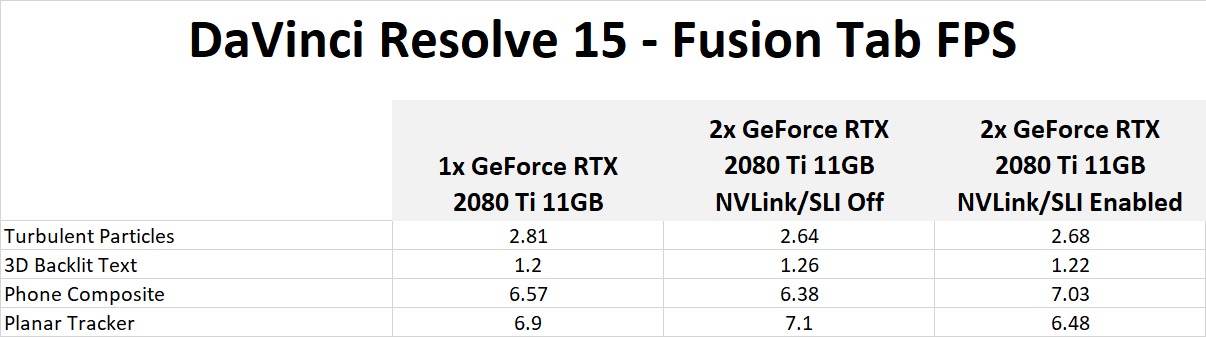 Fusion is relatively new to our DaVinci Resolve testing, and so far, we haven't been too impressed with how well it takes advantage of the GPU. To be fair, we are not using media in these projects that is particularly difficult to process, but given the FPS we saw in each project we doubt that that having multiple GPUs would significantly improve performance even if you are using 8K RED media. However, it is possible that either SLI or NVLink might help, so we went ahead and did the testing to find out.