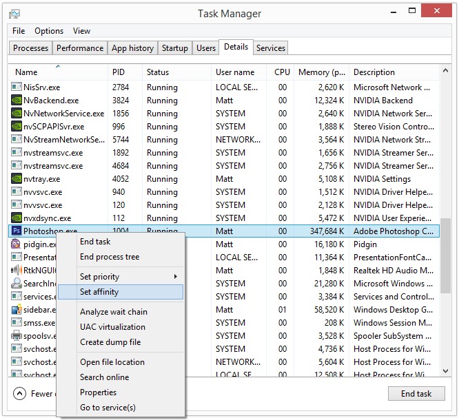 To set the affinity, simply launch the program you want to test, open Task Manager, right-click on the program listing under Details, select "Set Affinity", and choose the threads that you want to allow the program to use. Note that if your CPU supports Hyperthreading there will actually be twice as many threads listed than your CPU actually has cores. You can either disable Hyperthreading in the BIOS before doing your testing, or simply select two threads for every CPU core you want to test. Hyperthreading threads are always listed immediately after the physical core in Windows, so you would select two threads for every CPU core you want the program to use. In other words, selecting threads 1&2 will allow the program to just use a single CPU core, selecting threads 1-4 will allow the program to use two CPU cores, etc., etc.