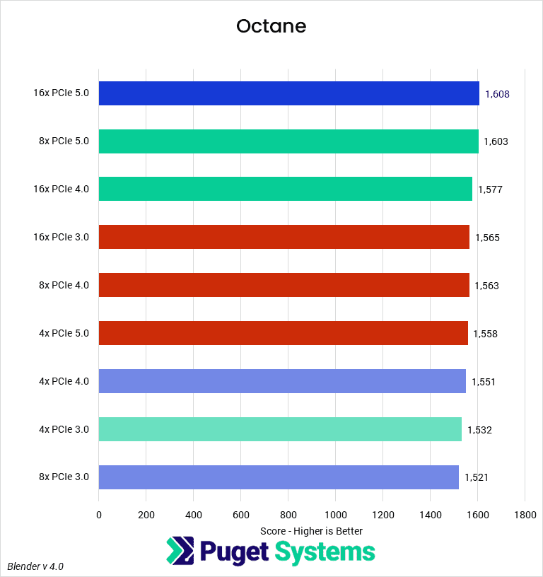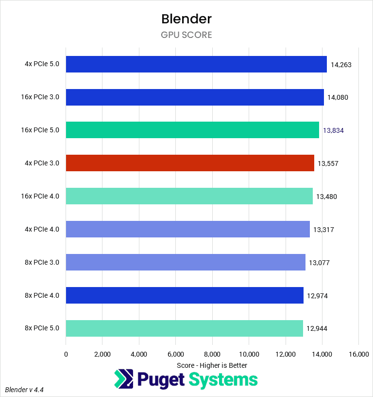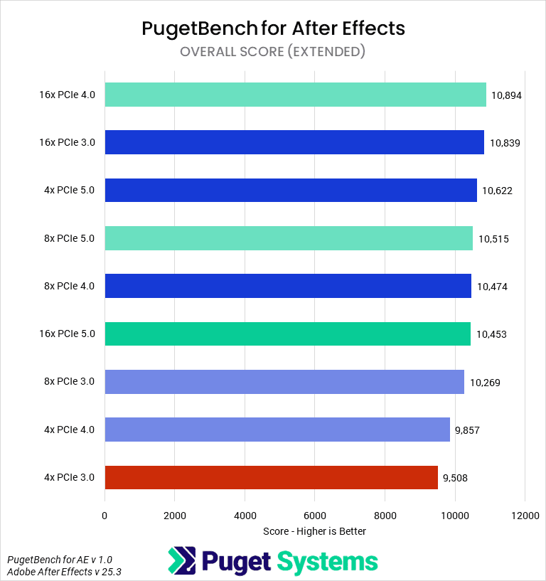 In video editing/motion graphics, we saw the largest impact. PCIe 5.0 x16, x8, and 4.0 x16 were functionally equivalent. However, below that, we started to see some differences, especially in DaVinci Resolve. In that application, 3.0 x16 was 10% slower, and our typical-case 4.0 x4 was about 25% slower. These margins are reduced in After Effects, but still present. We recommend caution when configuring a system for video editing applications with multiple add-in cards, as reducing the number of lanes available to the GPU can have a measurable impact on performance.