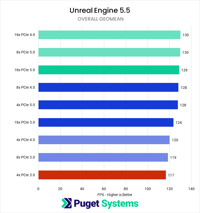 Our Unreal Engine benchmark results appear to be somewhere between DaVinci Resolve and After Effects. Like the former, there is clear clustering of the bandwidths, but, like AE, not many distinct “steps” exist. 5.0 x16, x8, and x4 as well as 4.0 x16 and x8, and 3.0 x16 are all functionally identical. 3.0 x16 looks like it may be a touch slower than the rest, but it is just within the margin of error for this testing. However, we do see results outside of that for the lower bandwidths. 4.0 x4 and 3.0 x8 are 93% as fast as the 64 GB/s results, and 3.0 x4 trails with 90% the performance.