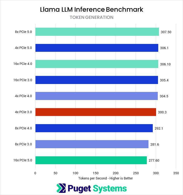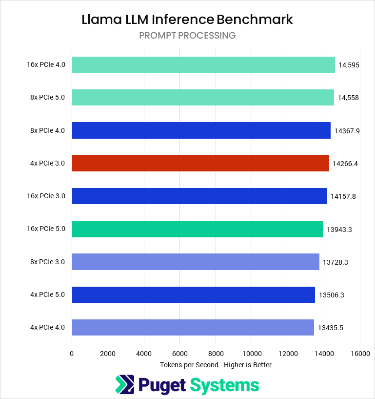 Finally, our Llama.cpp benchmark looks at GPU performance in prompt processing and token generation. For both workflows, the results seem effectively random, with no discernible pattern. The overall difference in performance is also fairly small, about 6% for prompt processing. Due to this, we would generally say that bandwidth has little effect on AI performance. However, we would caution that our LLM benchmark is very small, and LLM setups frequently involve multiple GPUs that are offloading some of the model to system RAM. In either of these cases, we expect that PCIe bandwidth could have a large effect on overall performance.