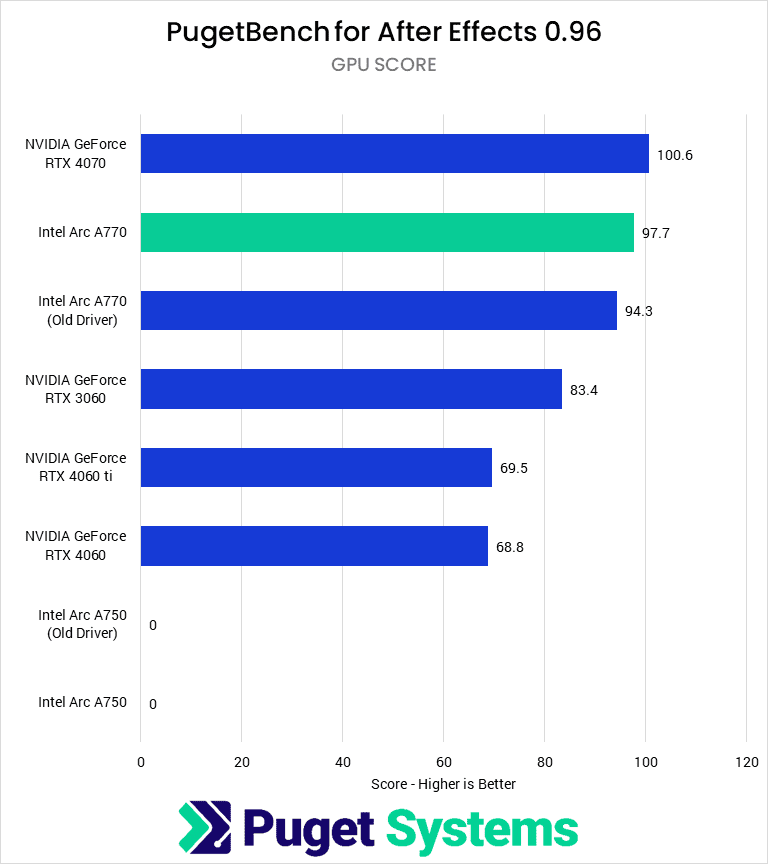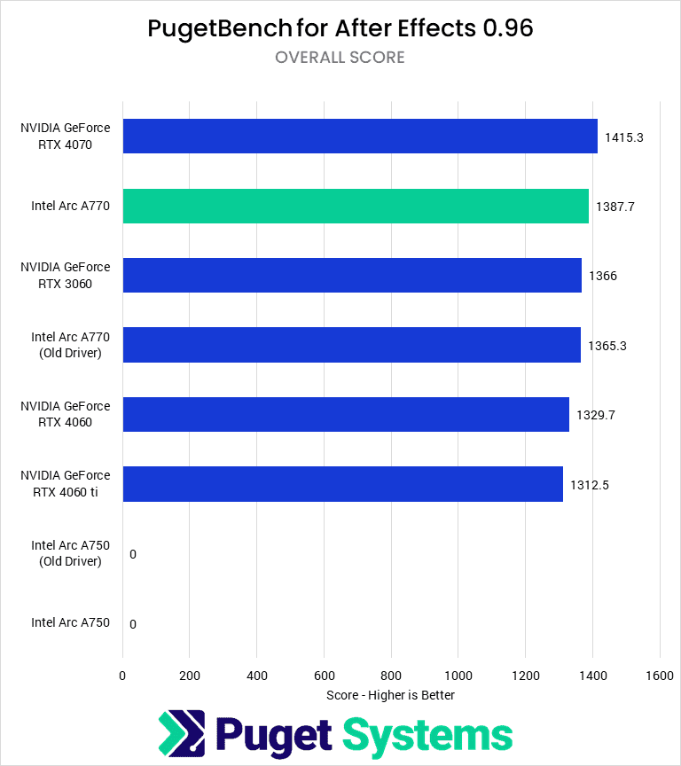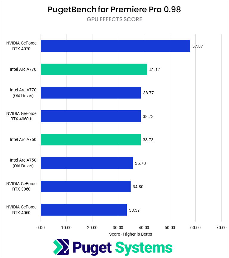 When isolating the GPU performance in After Effects, the A770 saw a large performance gain from driver and application updates. Last October, the RTX 3060 scored 20% higher than the A770. Now, the A770 outperforms the RTX 3060 by 17% on the newest driver and 13% on the older driver. This performance puts the A770 closer to the RTX 4070 than any of the RTX 3060, 4060, or 4060 Ti.