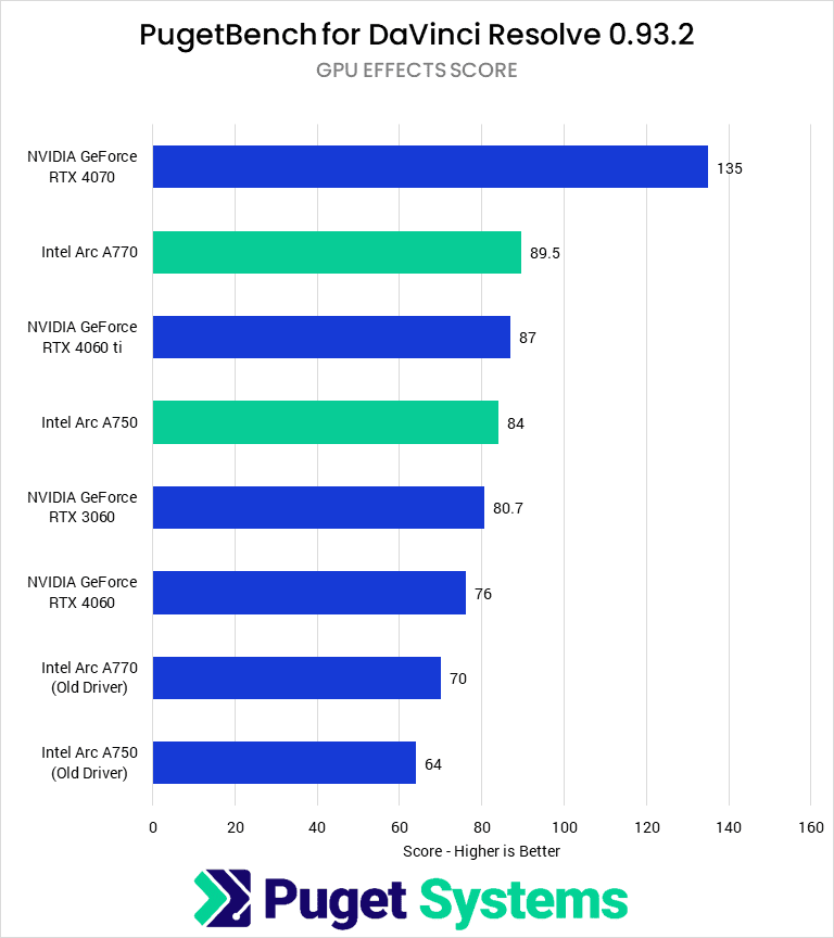 When we look at the individual sub-tests of our Resolve benchmark, the results look even better for Intel. In the GPU Effects portion, both the Arc cards went from being at least 12% slower than the RTX 3060 with their launch drivers to at least 5% faster with the latest drivers. The A770 even outperforms the 4060 Ti in this test, although it is still well behind the RTX 4070.