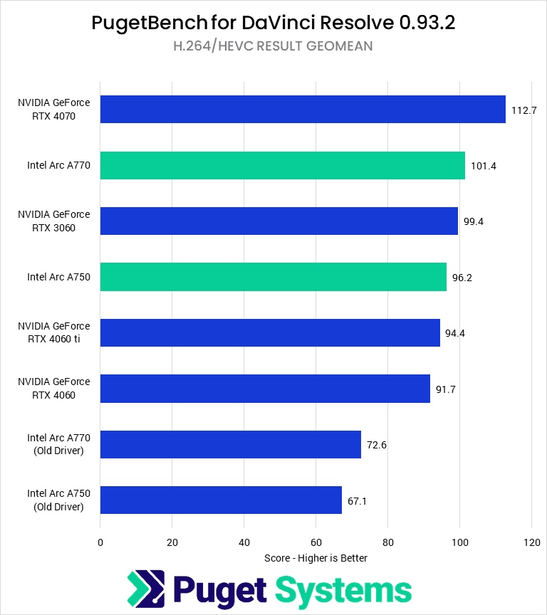 Beginning our testing with DaVinci Resolve, the overall score difference between the old and new drivers for the A770 and A750 is significant, with a performance uplift greater than 40%. Compared to the RTX 3060, the A770 is now within the margin of error of our test, while the A750 is about 14% slower—when we last tested these, they were 17 and 22% behind the RTX 3060. These uplifts also position the cards well against NVIDIA’s more recent GPUs, with the A770 beating the RTX 4060 and 4060 Ti and the A750 only being 5% slower.