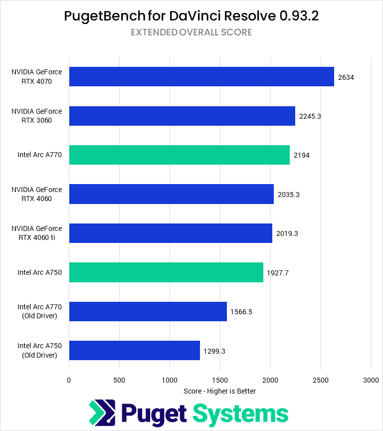Overall, DaVinci Resolve has seen a lot of improvements with Intel Arc GPUs over the last 11 months, culminating in more than a 40% performance uplift. This makes them well positioned now against the most recent competition from NVIDIA in their price range, with better performance and more VRAM from the A770 and performance parity from the A750. These are both solid options for budget GPUs in this application.