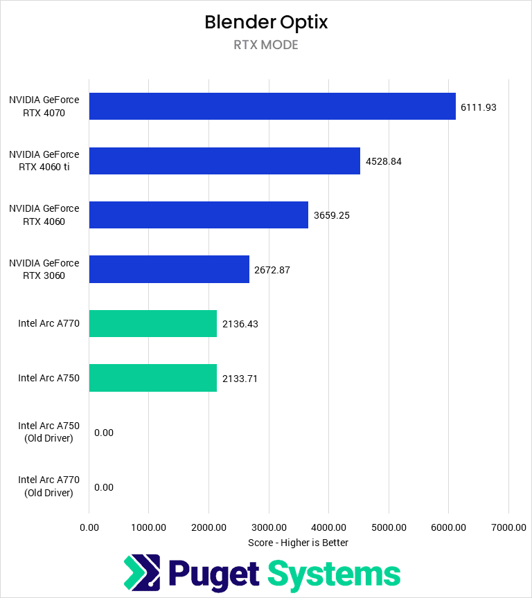 Although Blender has supported Intel GPUs since their release, NVIDIA was and is dominant in the GPU Rendering space by a large margin. This benchmark is interesting in that we found that the old drivers would not run on the most updated package and that the A770 and A750 performed nearly identically. The RTX 3060 still leads the A770 by 25%, and the RTX 4060 is more than 70% faster than the A770 for less money. Intel has made gains in this workflow, as in October 2022, they lagged behind the RTX 3060 by 33%. Even with this uplift, NVIDIA is the best option for GPU rendering.