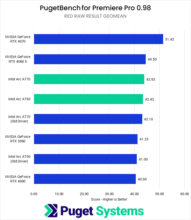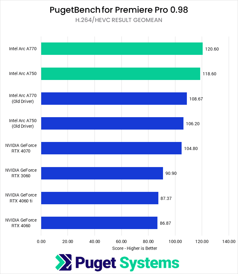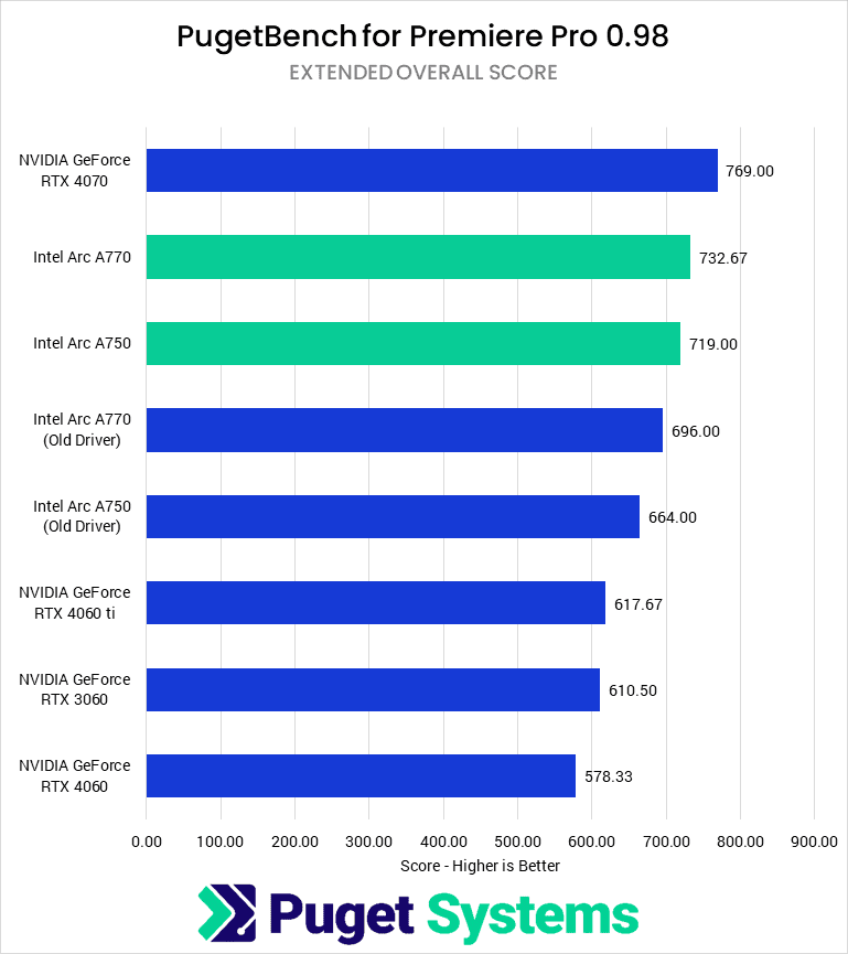 With the last 11 months of driver updates, Intel now has a solid lead in Premiere Pro performance, and both the A750 and A770 are great budget cards for this workflow, especially for use with H.264 and HEVC media.