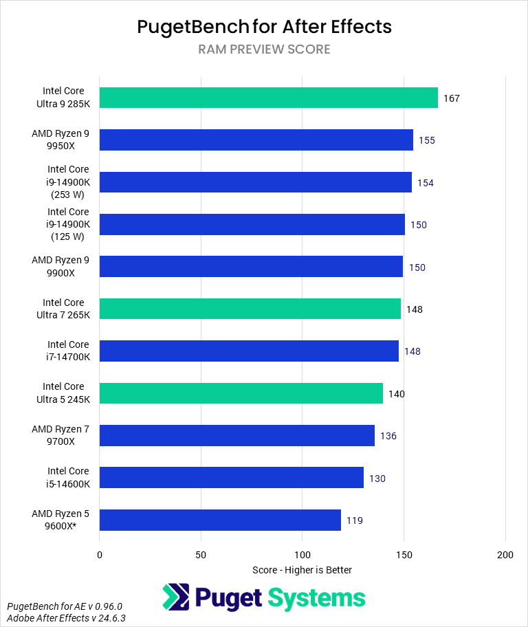 Finally, the Ultra 5 245K scores 9% higher overall than the 14600K, giving it a similar lead over the slightly cheaper 9600X and performance parity with the more expensive 9700X. This positions it 5% behind the 265K, but that isn’t evenly distributed. The 265K is 25% faster in our multi-core test using Adobe’s MFR feature but closer to 5% in most of the other tests. This positions the 245K as the best budget CPU for After Effects, with the step up to the 265K only really necessary for multi-core performance and the 285K for performance leadership.