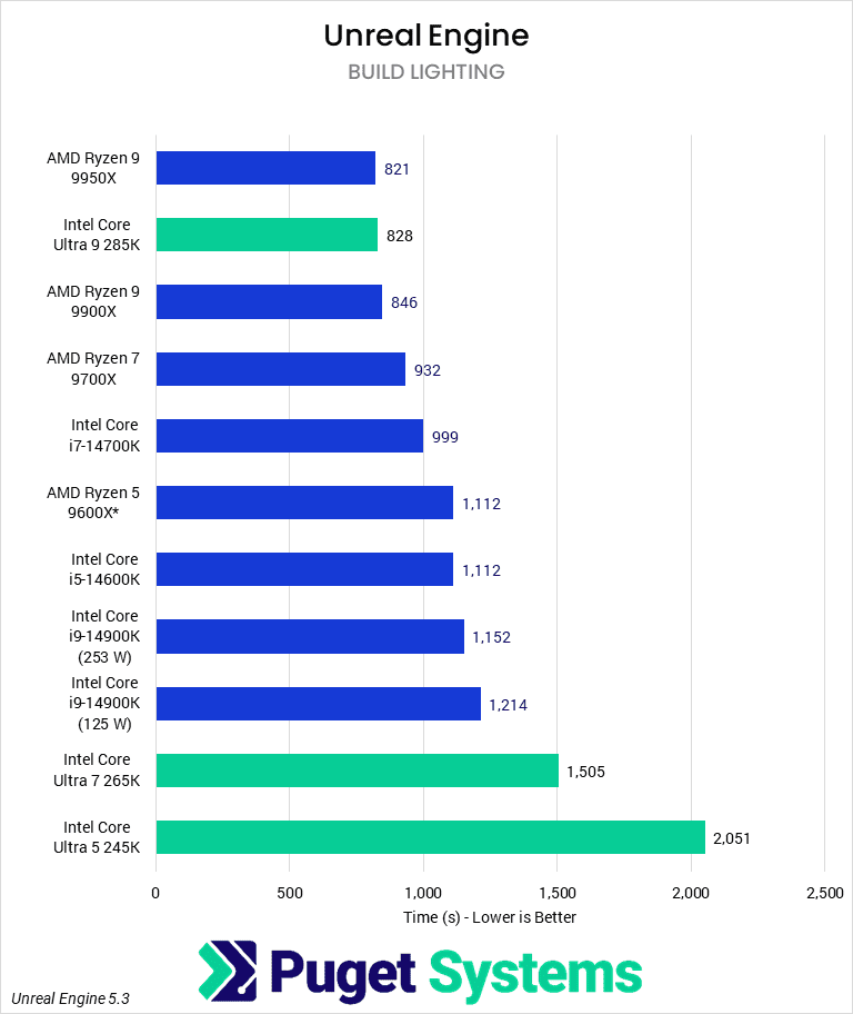 Light Baking frequently gives us the most trouble with the consistency of results of any of the three tasks, and we see that here with some odd outliers. In general, light baking tends to be AMD’s game to lose, with only the 285K managing to keep pace with the 9900X and 9950X, within a few percent either way. The next new Intel CPU to be featured on the chart is at the bottom with the 265K, taking 50% longer to complete the task than the 14700K or 9700X, while the 245K is closer to twice as long. Frankly, we don’t really trust that most of the Intel results are correct, but we would rather be transparent with that than hide potentially correct data. These odd results could be due to early motherboard BIOS, software bugs in Unreal Engine, or any other host of reasons.