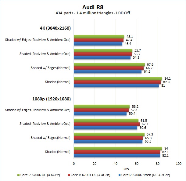 The FPS you can achieve when rotating a model is going to be heavily dependent on the complexity of the model, the quality settings you use, and the resolution of your display. For this test, we chose to use a fairly complex model as it gives us right around 60 FPS with our test setup. A less complex model may show a different result between the two overclocks, but if you are already getting 100-200 FPS, even a 10% improvement doesn't really mean anything since the FPS is already much higher than the human eye can actually detect.
