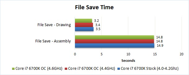 For saving files, we saw virtually no difference in the time it took to save an assembly file, although we did see an improvement with the drawing file. In our storage testing, we found that saving this assembly file was bottlenecked with the storage drive, so in this instance having a faster CPU doesn't make a difference. For saving a drawing file, however, we saw about a 3% improvement with a 4.4GHz overclock and a 9.5% improvement with a 4.6GHz overclock. Keep in mind, however, that since the save time is only ~3.5 seconds, even a .2 second improvement works out to be about 3%. So a 9.5% improvement may prove to be an optimistic amount of time savings.