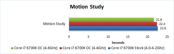 Our motion study consists of a 10 second, 60 FPS animation. With a 4.4GHz overclock, it took .2 seconds less time to complete the calculations resulting in just under a 1% improvement in performance. With a 4.6GHz overclock, we saved exactly a second which works out to be a 4.6% improvement in performance.
