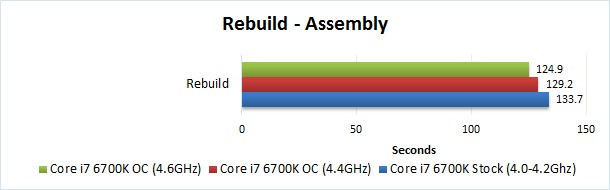 Rebuilding our assembly took a fair amount of time, so we managed to save 4.5 seconds with a 4.4GHz overclock and almost 9 seconds with a 4.6GHz overclock. This works out to be a 3.5% and 7% improvement respectively.