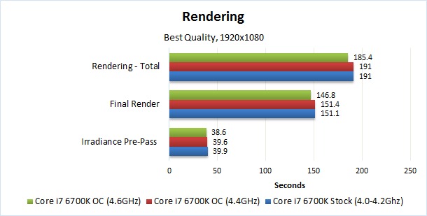 Starting with the irradiance pre-pass we see about a 1% performance improvement with the 4.4GHz overclock and a 3.5% improvement with the 4.6GHz overclock. For the final render we actually saw a slight decrease in performance with the 4.4GHz overclock (small enough that it is within the margin of error), but a 3% improvement with the 4.6GHz overclock.
