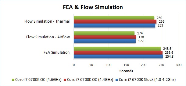 Simulations often require you to wait on them before proceeding, so any time savings can be significant. However, with a 4.4GHz overclock we saw no difference in the time it took to complete the Flow simulations (worse performance, actually), and only a small 1.2 second improvement for the FEA simulation which works out to about a .5% improvement.