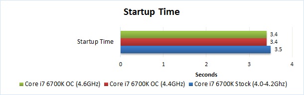 To start off our testing, we timed how long it took for Solidworks to startup. The smallest unit of measurement we are using is a tenth of a second and, as you can see, both the 4.4GHz and 4.6Ghz overclock resulted in a difference that is as small as we could measure. This difference works out to be about a 3% improvement, although .1 seconds is so small that you could argue that it is within a reasonable margin of error for our testing.