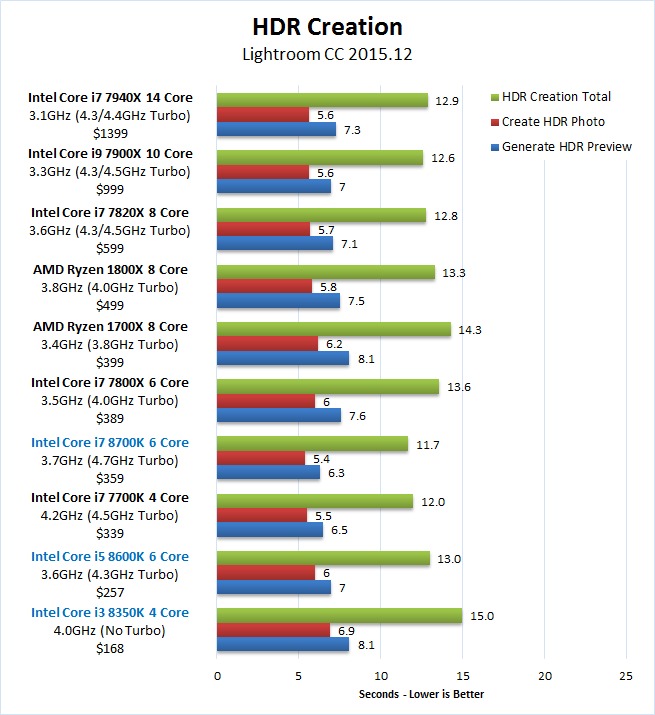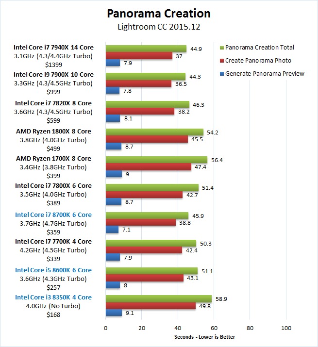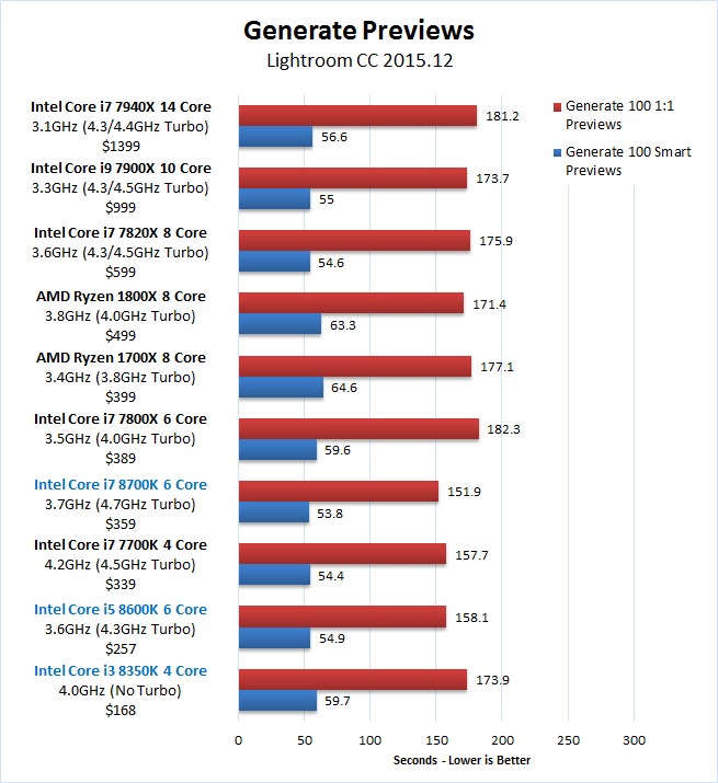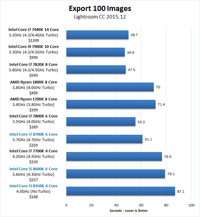 While Intel is releasing a number of "Coffee Lake" 8th Generation CPUs, in this article we are primarily going to focus on the Core i7 8700K, Core i5 8600K, and Core i3 8350K to see how they perform in Lightroon. If you wish to read one of our other Coffee Lake articles to see how they perform in applications like Premiere Pro, Photoshop, and After Effects, you can view a full list here.