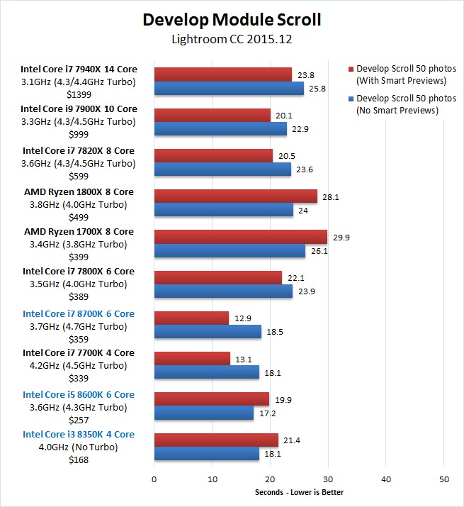 The main users who will benefit from the new Coffee Lake 8th Gen CPUs are those that export a large number of images, but also want the best performance when generating previews, applying corrections, or almost anything else in Lightroom. For this kind of user, the Core i7 8700K in particular is an excellent CPU since you not only get a small performance increase for general tasks, but also a large 25% increase in performance when exporting. Those that are simply looking to get their export times down as much as possible may want to consider a CPU like the Core i7 7820X or even the Core i9 7900X since they are significantly faster for exporting, but we would consider the Core i7 8700K to be the more balanced option for the average Lightroom user.