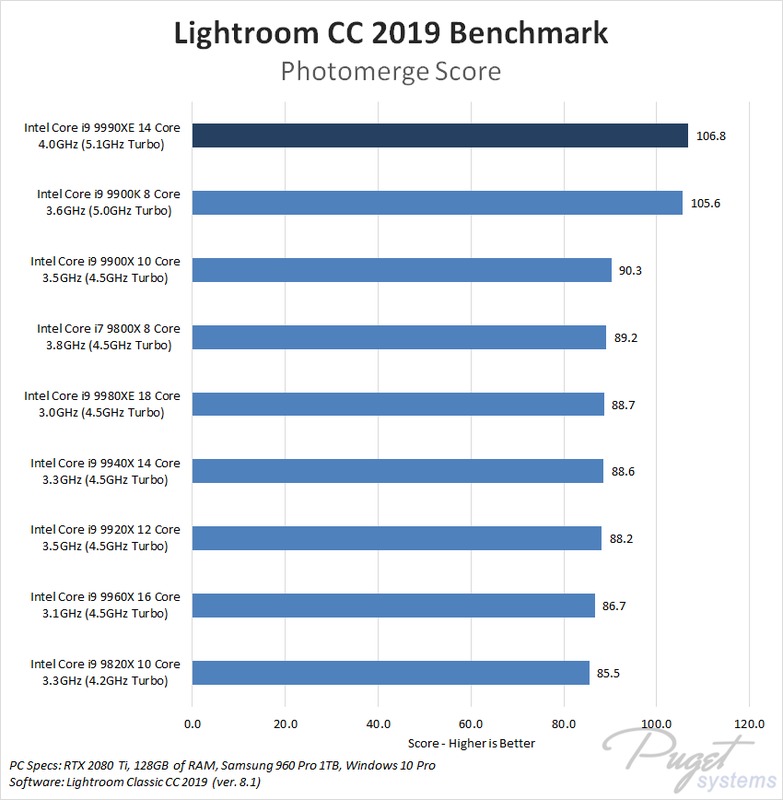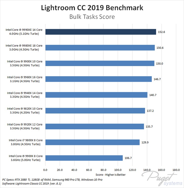 While the Intel Core i9 9990XE achieved a higher overall benchmark score in Lightroom Classic than any other CPU we tested, that doesn't mean it is an automatic pick even assuming you can get your hands on it. If creating previews or panoramas is a big deal for you, this processor is excellent. If you care more about performance when navigating and using the library and develop modules, however, the Core i9 9900K is still a bit faster – not to mention much more affordable.