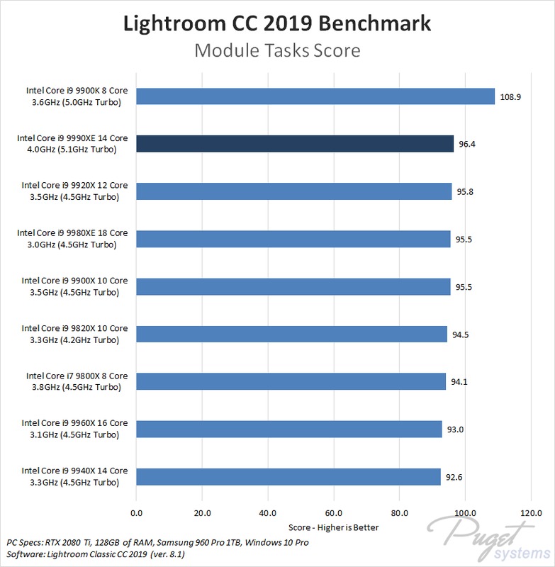 Because of the fairly standard performance in our Module tests, the i9 9990XE is definitely more of a luxury item for Lightroom Classic rather than something you should really try to get your hands on. There are likely a number of users who will desire the higher preview generation performance, but most users will likely have a better experience sticking with a Core i9 9900K and spending the large cost savings on more RAM, faster/larger storage drives, or other system improvements.