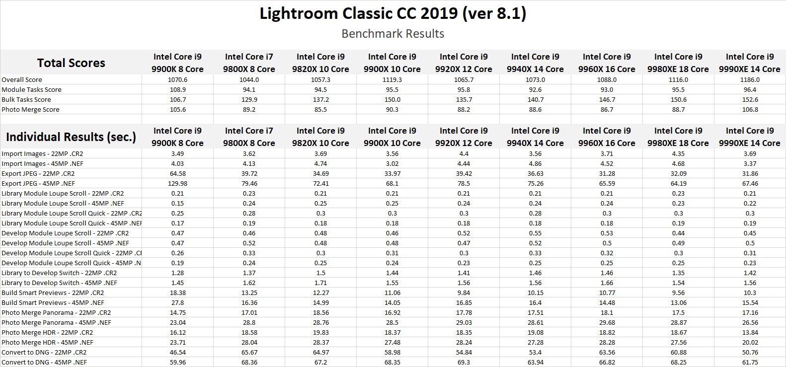 If we sort by the overall score, you can see that the Intel Core i9 9990XE's does very well, scoring about 6% faster than the other Intel X-series CPUs or about 11% higher than the Intel Core i9 9900K. However, it is very important to pay attention to the scores for the individual categories since most people value speed and responsiveness when working in the library/develop modules rather than exporting or generating previews.