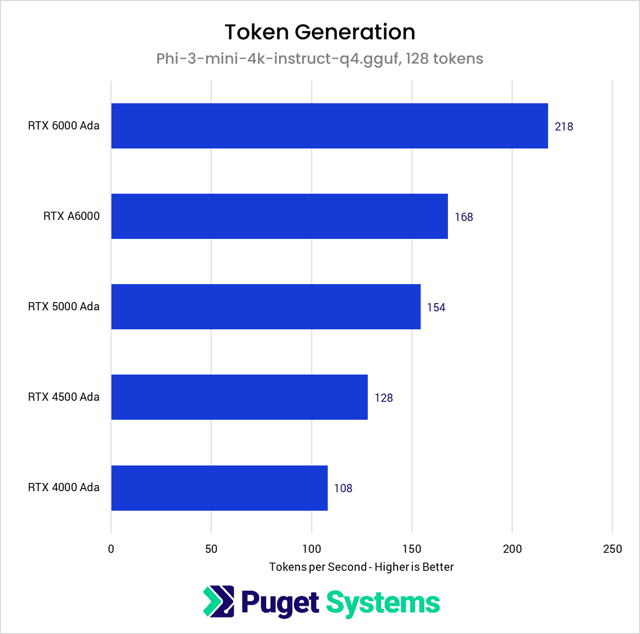 Llama.cpp build 3140 was utilized for these tests, using CUDA version 12.2.0, and Microsoft’s Phi-3-mini-4k-instruct model in 4-bit GGUF. Both the prompt processing and token generation tests were performed using the default values of 512 tokens and 128 tokens respectively with 25 repetitions apiece, and the results averaged.