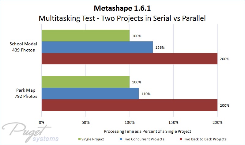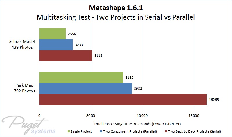 Here is a gallery showing the results, in seconds, for processing each image set by itself ("single project") as well as the longer of the two times from our concurrent testing ("parallel"). I also included a third result, which is just the single project time doubled up to show how long it would have taken to process it twice back to back ("serial") instead of at the same time.