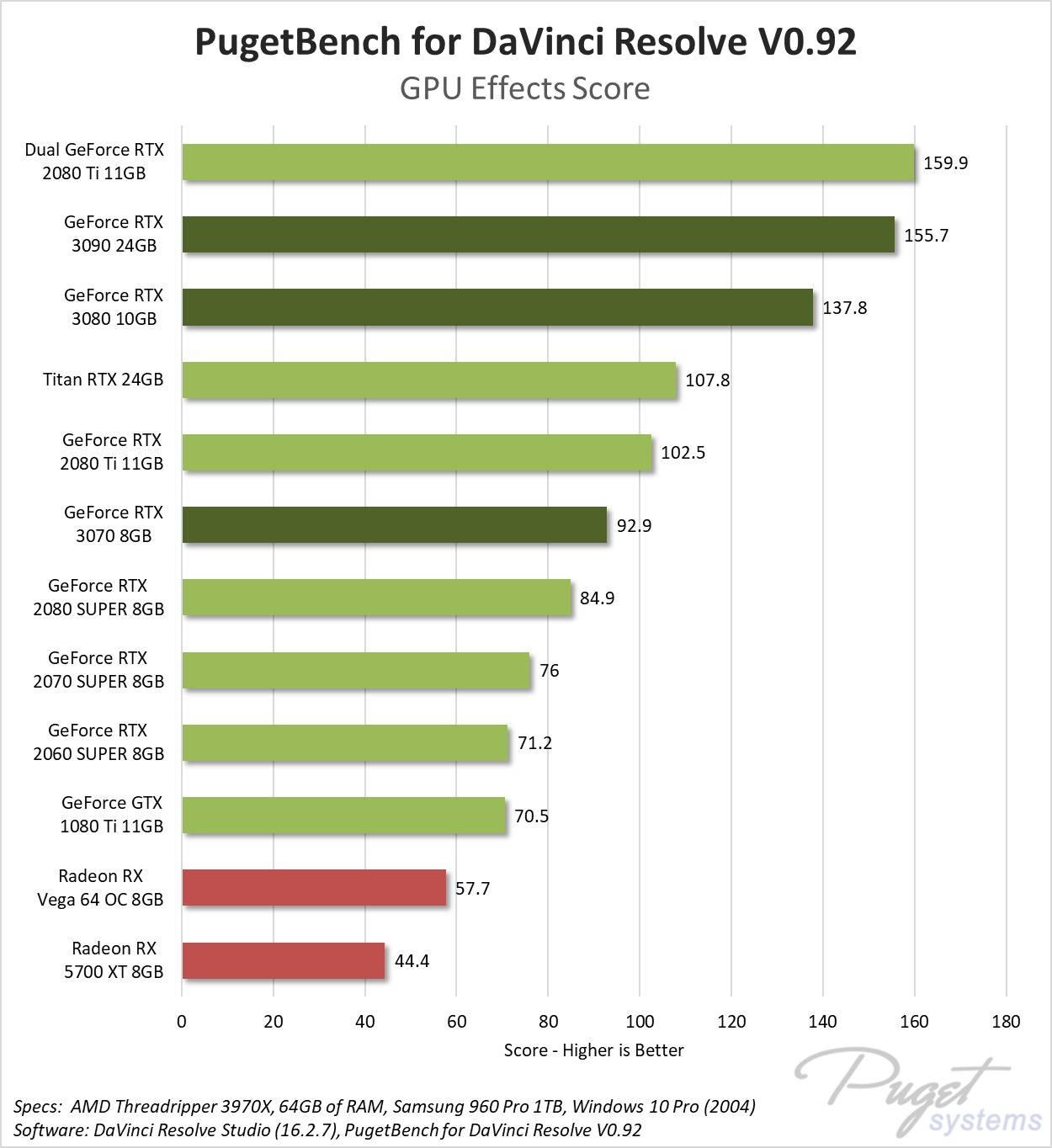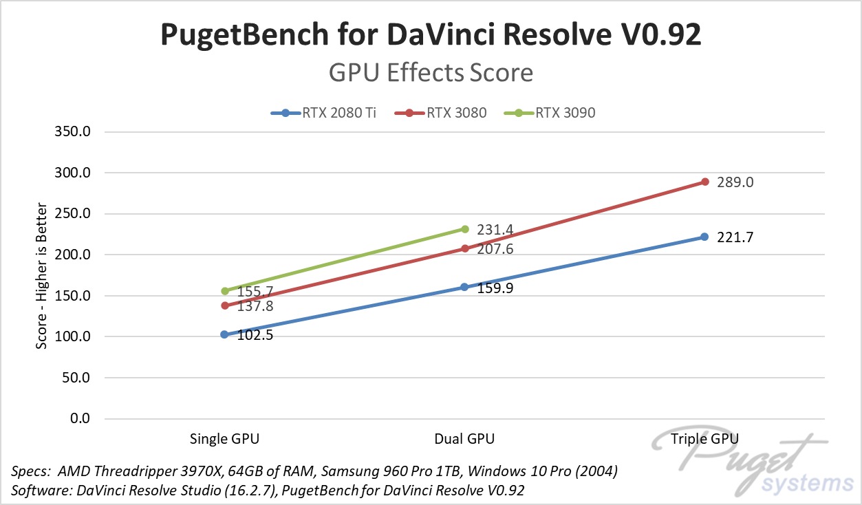 Read the full articles: DaVinci Resolve Studio – NVIDIA GeForce RTX 3070, 3080 & 3090 Performance | DaVinci Resolve Studio – RTX 3080 & 3090 Multi-GPU Performance Scaling