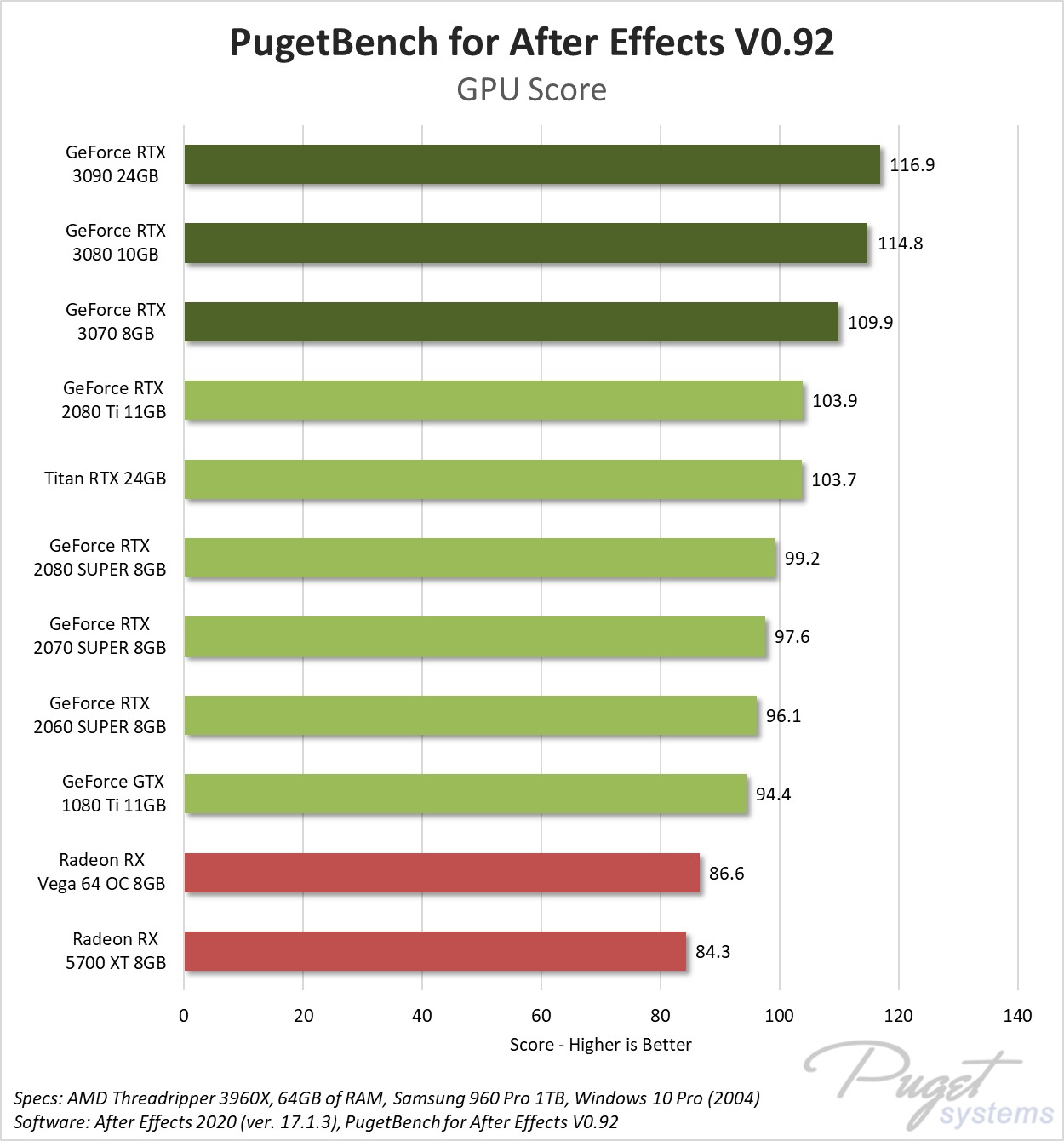 Summary: For most users, After Effects is going to be CPU bottlenecked long before the performance of your GPU comes into play. However, in certain After Effects workloads, the new GeForce RTX 3070, 3080 and RTX 3090 can be around 6-12% faster than the previous generation RTX 2080 Ti, or 27-35% faster than the AMD Radeon cards that are currently available.