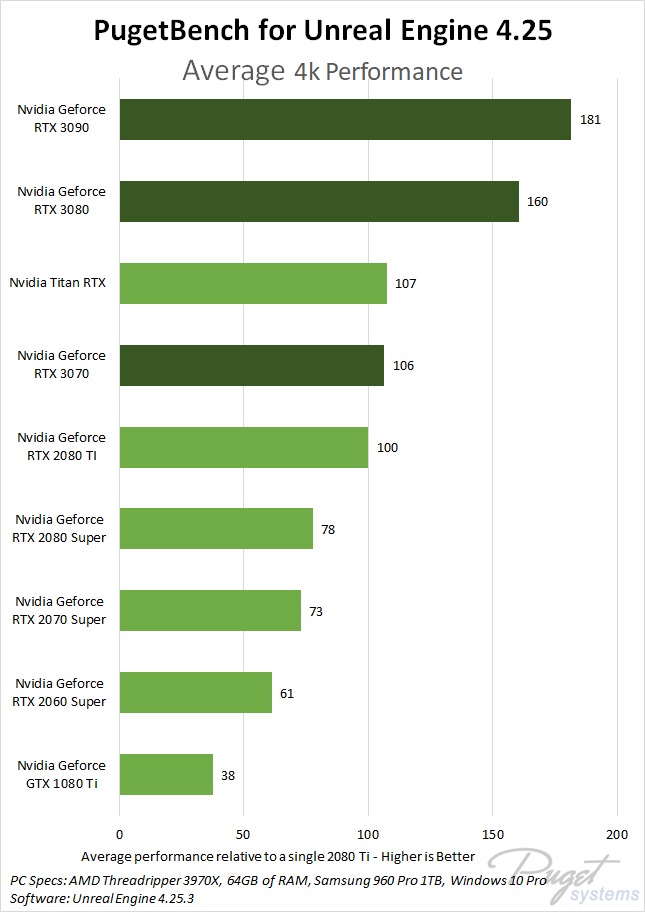 In GPU render engines like OctaneRender, Redshift, and V-Ray, the RTX 3080 and 3090 greatly out-perform the RTX 2000-series cards, beating the previous generation RTX 2080 Ti by a large 60% and 90% respectively. Even the affordably-priced RTX 3070 matched or beat the 2080 Ti and Titan RTX, though its 8GB of VRAM will limit how large of scenes it will be capable of rendering. Unreal Engine also saw massive performance gains, averaging 60-80% higher performance gains over the RTX 2080 Ti.