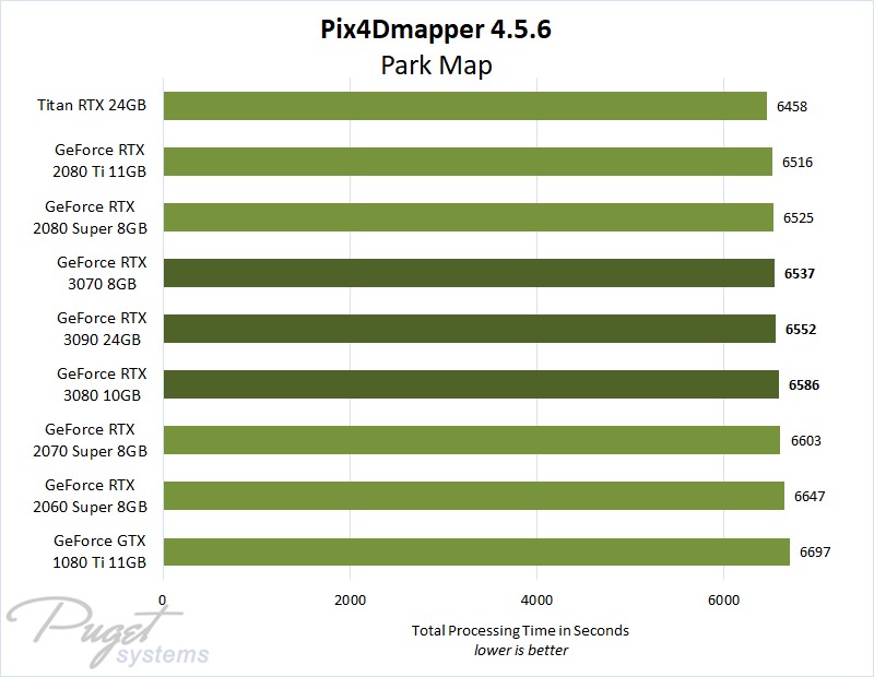 The RTX 3080 and 3090 offer fine performance in Pix4D, but the much cheaper GeForce RTX 3070 is just as fast in this application – so it is going to be the best choice for most users. If you already have a high-end GeForce 10 or 20 Series card, however, there is no reason to upgrade.