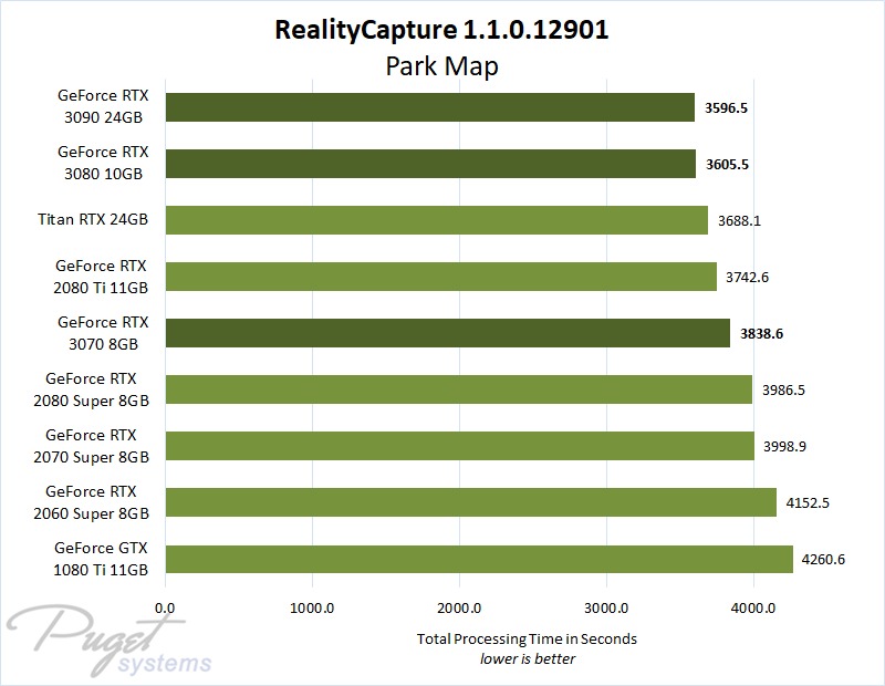 Summary: NVIDIA's GeForce RTX 3080 turned in excellent performance in our benchmark tests, effectively matching or beating the much more expensive Titan RTX. The RTX 3090 is a hair faster yet, but for the additional $800 it costs the processing speed boost is negligible. The RTX 3070 did well too, but was measurably behind the bigger cards. Similar performance to the RTX 3090 for less than half the price makes GeForce RTX 3080 the best video card for RealityCapture at this time.