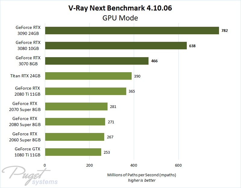 Summary: The new GeForce RTX 30 Series video cards provide fantastic rendering speeds. The RTX 3070 and 3080 offer comparable performance for their respective prices, but the 3080's additional 25% of onboard VRAM makes it a better choice for most users. Those wanting the fastest rendering times, or working with complex scenes, will appreciate the GeForce RTX 3090's top performance, its massive 24GB of memory, and better support for multi-GPU configurations (via NVLink and variants with rear-exhaust coolers).