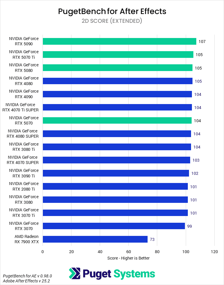 For traditional After Effects usage, the graphics card is still largely irrelevant, and a cheaper card is typically preferred so that more of your budget can be allocated to CPU, RAM, or storage. However, if you are looking to explore the new 3D workflows in After Effects, the new 5070 can offer a compelling upgrade over older cards and is especially strong compared to AMD’s Radeon cards.