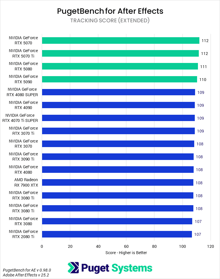 In terms of overall performance (which includes both CPU and GPU-focused tasks), the 5070 scores 7% higher than the 4070 SUPER and 18% higher than the 3070. Two of our subscores, 2D (Chart #2) and Tracking (Chart #4), are principally CPU-bound, so we see no real difference in them. However, in 3D workflows (Chart #3), the 5070 extends the leads to 14% and 52% over the 4070 SUPER and 3070, respectively. These are both great generational and skip-generation uplifts.