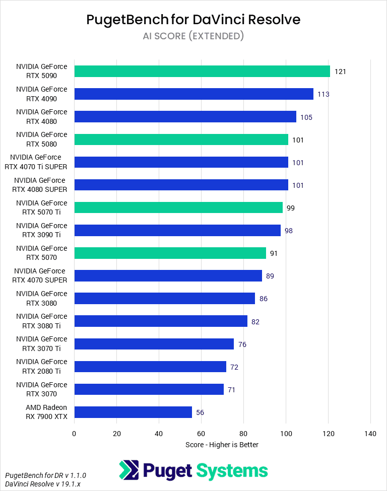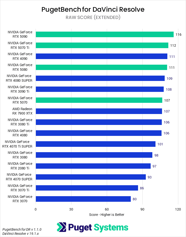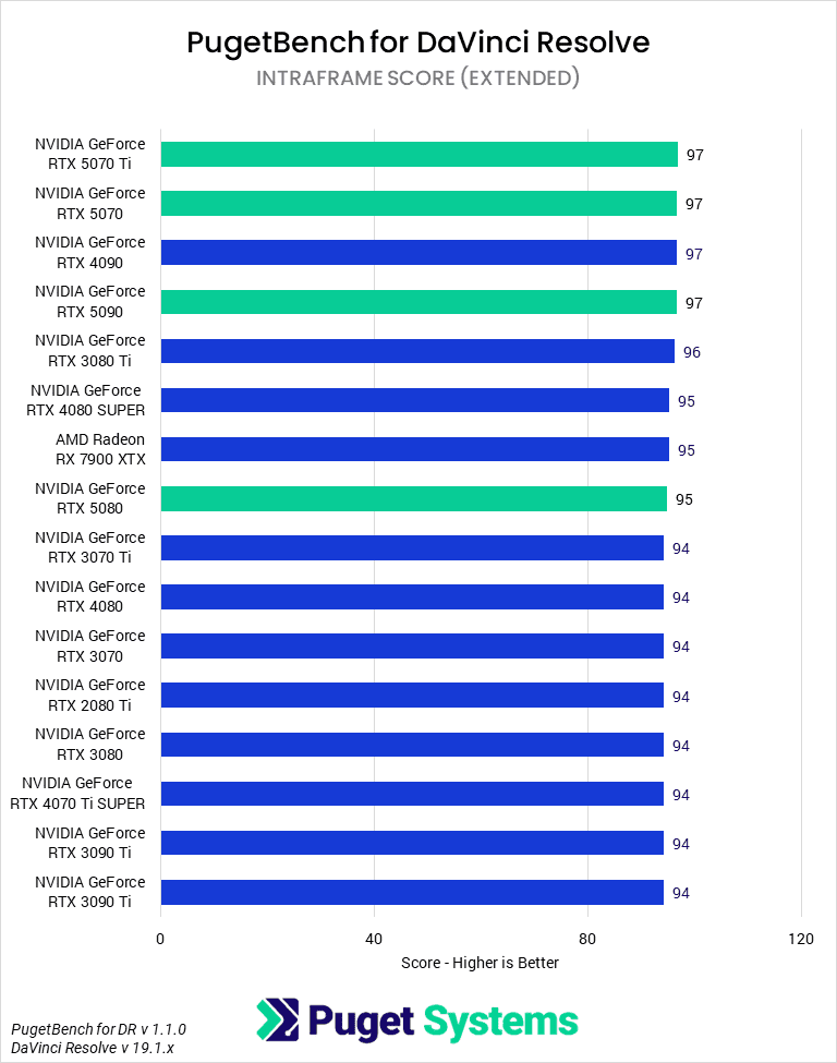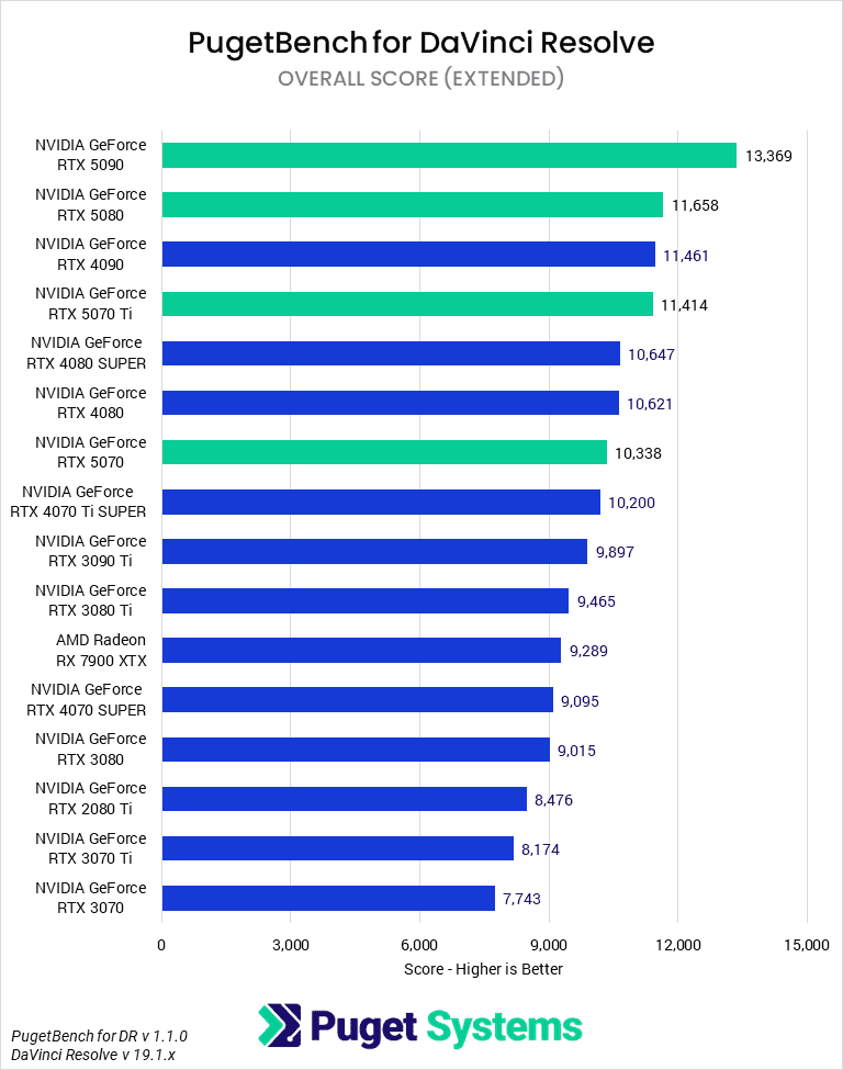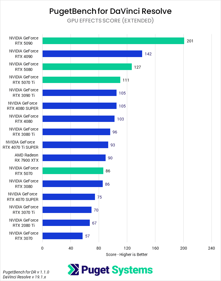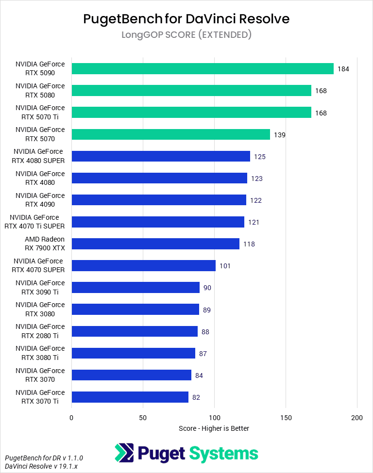 As an application, DaVinci Resolve tends to be more sensitive to GPU performance than Premiere Pro or After Effects. Additionally, NVIDIA has provided a pre-release version of DaVinci Resolve to reviewers which is compatible with 50-series cards and properly uses the updated NVENC/NVDEC engines to accelerate additional “flavors” of LongGOP codecs, such as HEVC 4:2:2 10-bit.