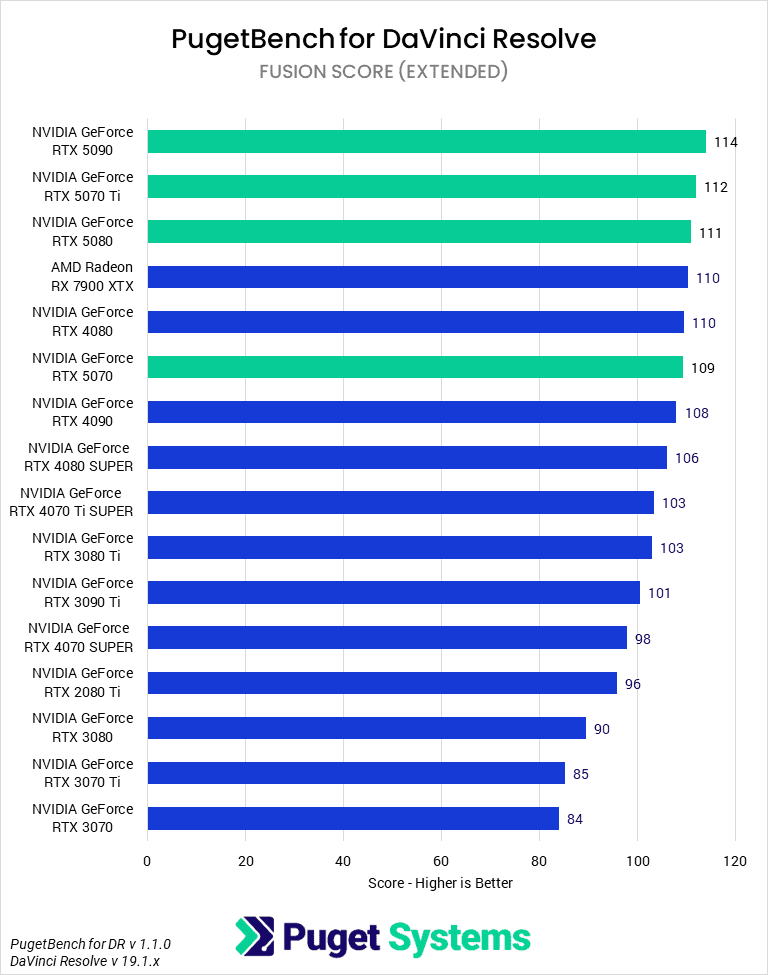 Overall, this means that the 5070 scores 14% higher than the 4070 SUPER and 34% higher than the 3070. Much like Premiere Pro, though, there are some subtests that do not effectively make much use of the GPU, such as Intraframe (Chart #3), RAW (Chart #4), and Fusion (Chart #5). In the first of these, GPU has no effect, while in the latter two, the 5070 is about 11-15% faster than the 4070 SUPER and 30% faster than the 3070.