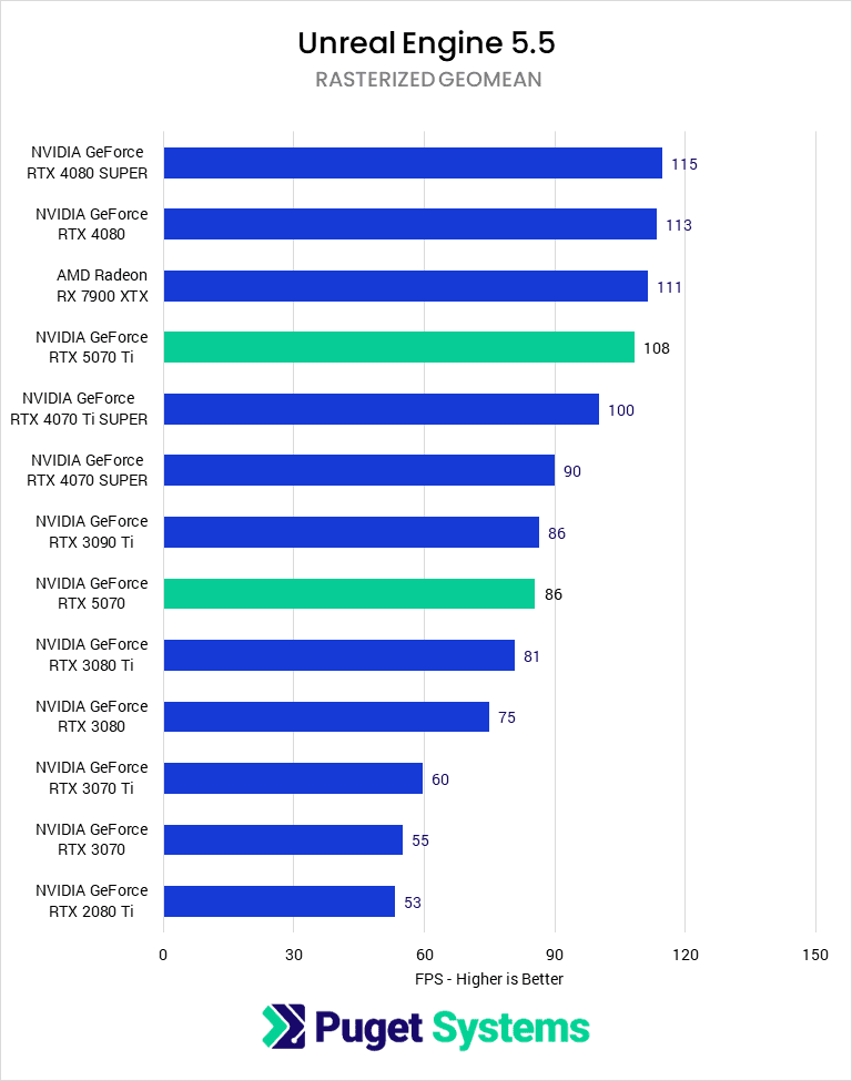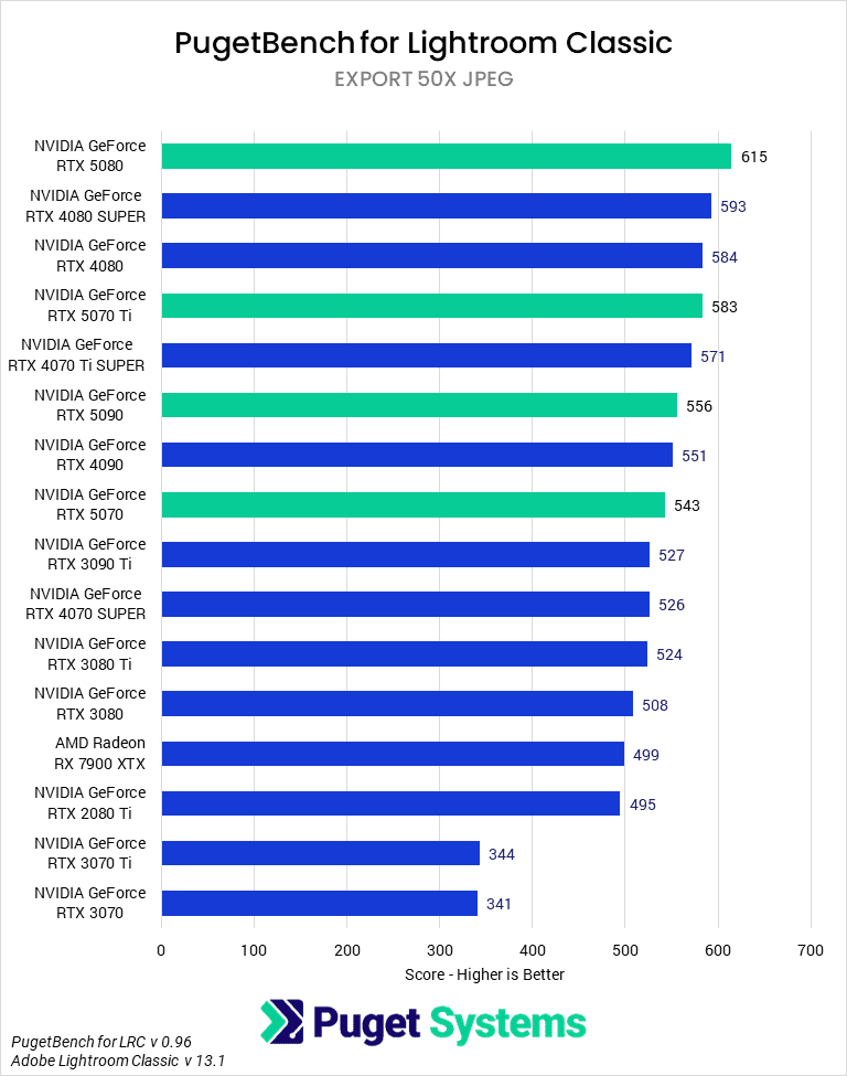 When looking at a GPU-accelerated portion of the benchmark, image exporting (Chart #2), there is a larger difference between cards. Here, the 5070 is well ahead of the 30-series cards, leads the 4070 SUPER by 3%, and falls behind the 4070 Ti SUPER by 5%. The latter two are within the margin of error, especially since Lightroom tends to have a larger amount of variance in its tests.