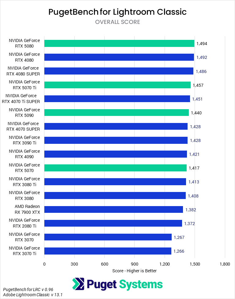 In the overall score (Chart#1), the 5070 is on-par with the RTX 4090, although the majority of the tests in Lightroom Classic are unaccelerated, so the overall score really isn’t all that meaningful since almost every GPU performs within the margin of error.