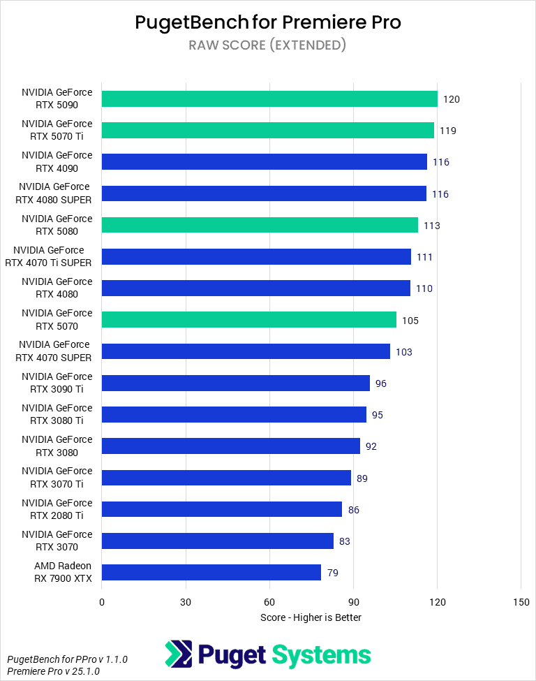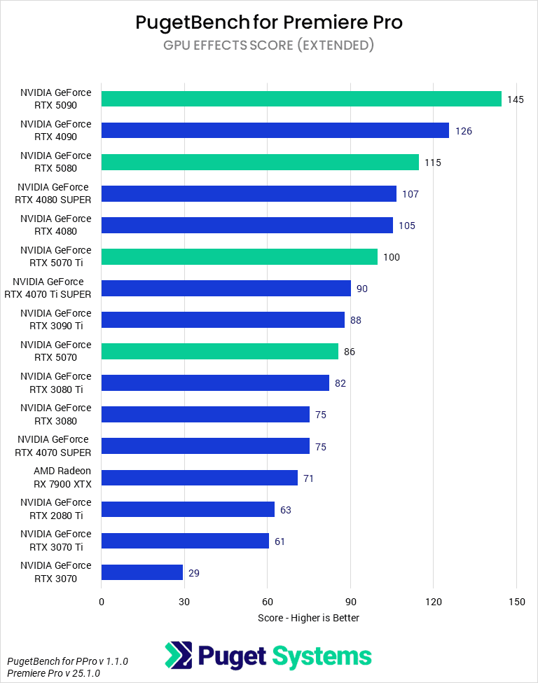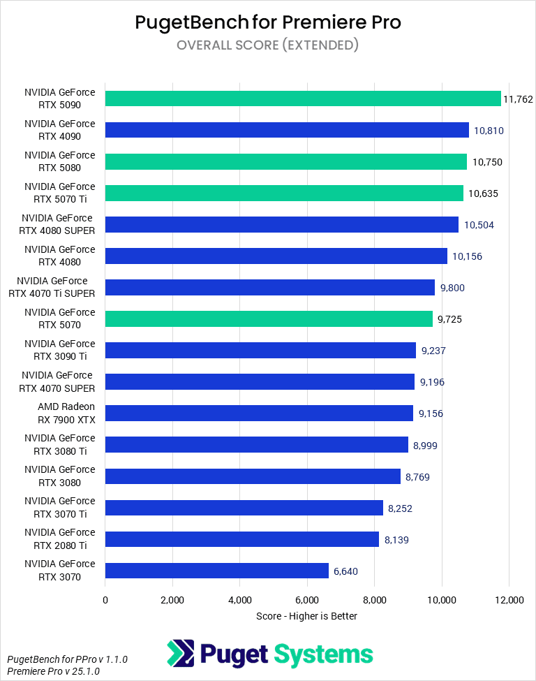 Premiere Pro is a much more GPU-accelerated application than Lightroom Classic. In it, the RTX 5070 is essentially equivalent to a 4070 Ti SUPER and leads the base 4070 SUPER and 3070 by 6% and 18%, respectively. This is even given that Adobe has yet to fully add support for the new media engines of the 50-series cards, meaning we expect this gap to grow in the future.