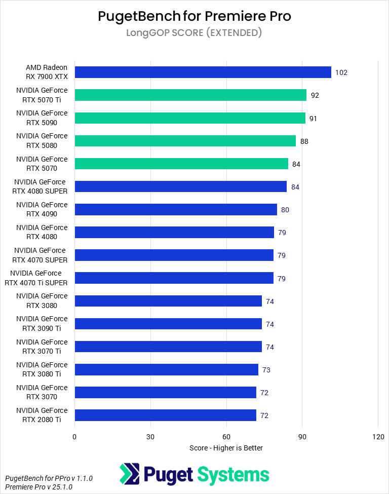 Our LongGOP tests (Chart #2) are where we would expect the media engines to play a large role in elevating the performance of the 5070. Although NVIDIA’s next-generation NVENC/NVDEC are faster than last gen, making the 5070 6% faster than the 4070 SUPER and 17% faster than the 3070, when support for the new H.264/HEVC 4:2:2 10-bit acceleration is implemented by Adobe, we expect this lead to grow.