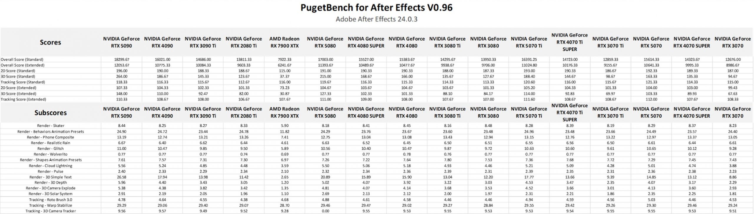Though traditionally a CPU-based application, After Effects has added 3D capabilities that rely heavily on GPU acceleration. We recently updated our Pugetbench for After Effects benchmark to test these capabilities, and we are excited to be able to include After Effects in our GPU reviews.
