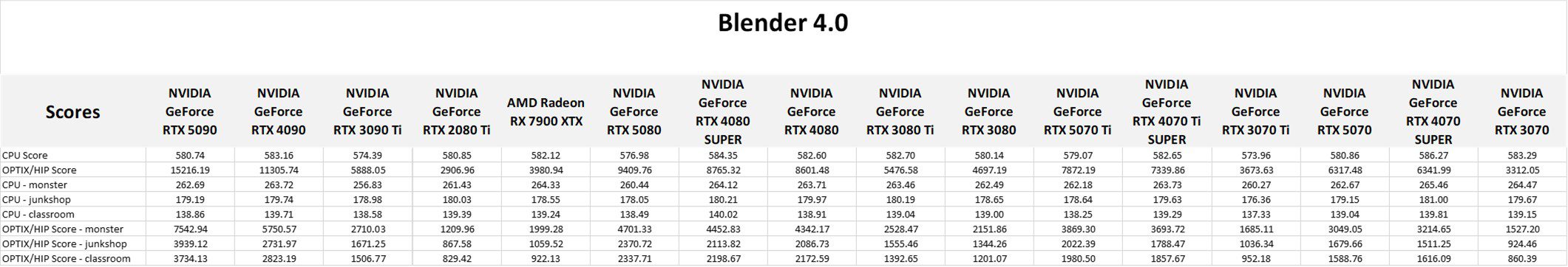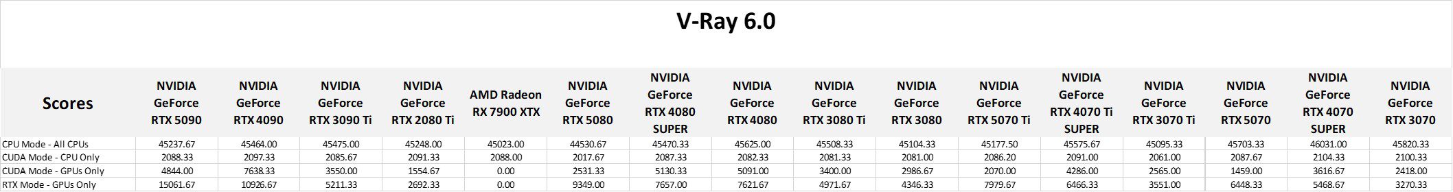For offline, GPU-based rendering, we could only test with two of our usual four benchmarks. At present, the 50-series cards have only experimental support in Redshift 2025.13 (but no compatibility with Cinebench 2024, which uses the Redshift renderer) and support in the OctaneRenderer 2025.1-beta 2 (but not in OctaneBench); as such, we were not able to test with either. Additionally, there is currently a known issue with CUDA rendering in V-Ray, resulting in low performance. We expect that this will be fixed as the implementation of the CUDA 12.8 toolkit is rolled out to applications, but it is definitely a note of caution for early adopters of the 50-series.