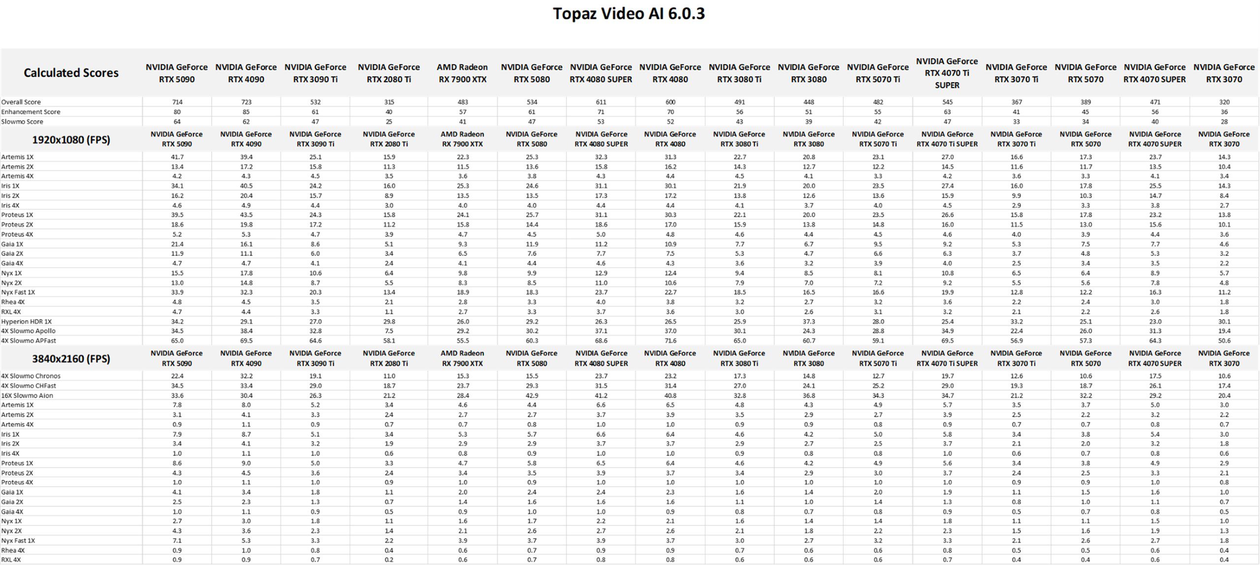 Topaz Video AI is an application that uses AI models to upscale lower-resolution video to a higher-resolution output or low framerate to a higher framerate. We use the built-in benchmark to test performance across all of the included models at both 1080P and 4K and then combine those together into a singular overall score.