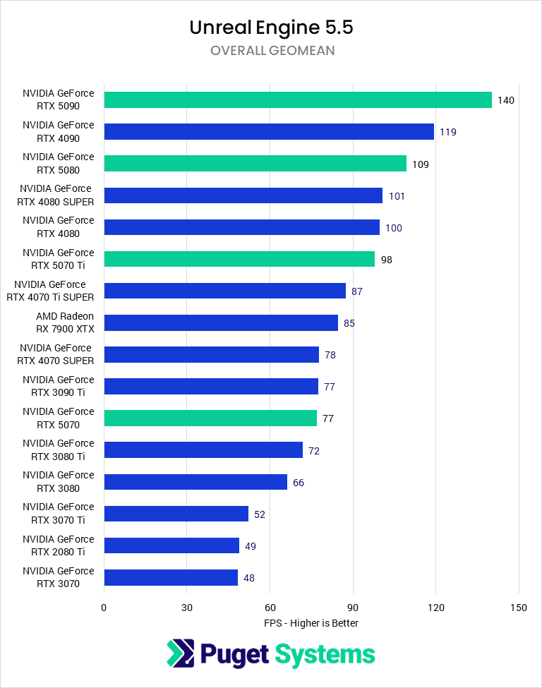 In terms of applications, the new NVIDIA Blackwell cards have some lingering compatibility issues at present as we await developers’ integration of the new CUDA 12.8 and TensorRT 10.8 toolkits. As a result, the RTX 50-series of graphics cards is not supported in Redshift (Cinebench) or Octanebench—though the latest version of the core Octane renderer does support them—and has performance issues in V-Ray CUDA rendering. Due to this, we have slightly fewer results than is typical for our GPU reviews: PugetBench for Premiere Pro, After Effects, DaVinci Resolve, and Lightroom Classic, as well as Unreal Engine, V-Ray, and Blender.