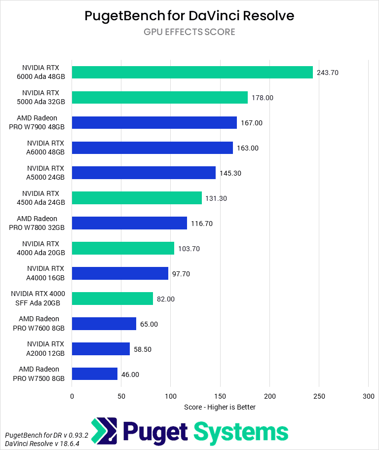 In lighter GPU workloads (real-time rendering in Unreal Engine and video editing in DaVinci Resolve/Premiere Pro), the generational performance gains are not quite as large, but still significant. It changes depending on the specific workload, but the new NVIDIA RTX 6000 Ada is often around 50% faster than the previous generation A6000 or AMD’s Radeon PRO W7900. That is almost exactly in line with the price increase, however, so while it does get you more total performance, the price-to-performance is only about on par with the previous generation.