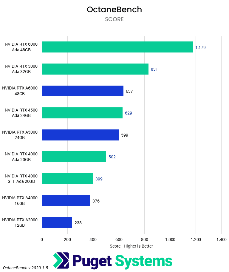 GPU rendering is where NVIDIA GPUs really shine. The RTX 6000 Ada is able to double the score of the RTX A6000, though it is $2-3k more expensive. The RTX 5000 Ada is actually closer in price, being roughly 10% less expensive than the RTX A6000, yet is still nearly 40% faster. So even if you don’t want to spend more money than the last generation,  you can still get much better performance.