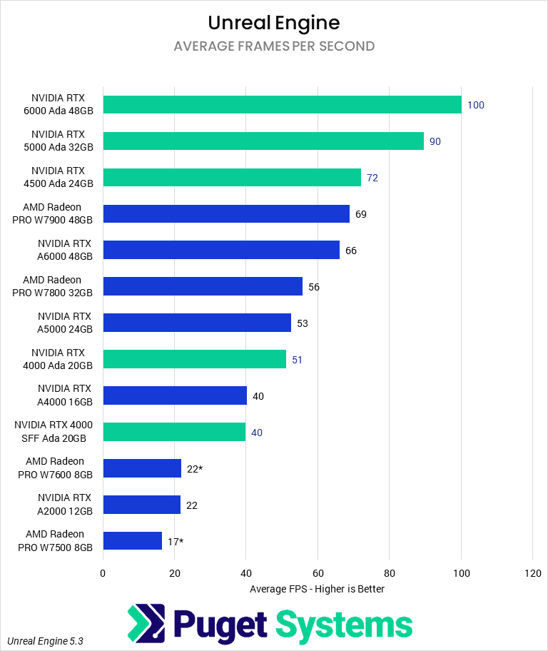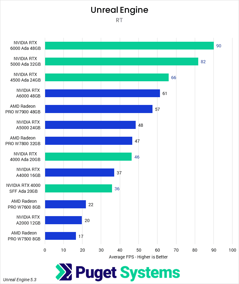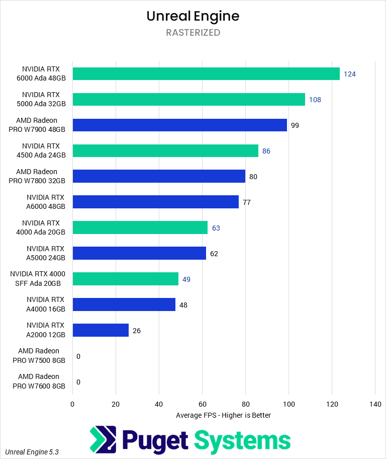 AMD’s GPUs may not gain much ground in the Virtual Production fields, but their strong rasterized performance—and large 32GB of VRAM—will make for interesting options in the Game Development space. Do note that for some reason, the Radeon PRO W7600 and 7500 could not complete the rasterized tests we use in our benchmark. This is unusual as Rasterized performance is a strong suit for AMD, but using such a low tier of card for Unreal would be something of a niche case anyway.