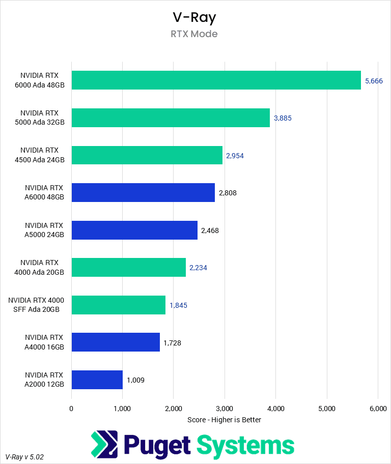 For GPU rendering workloads (with applications like OctaneRender, V-Ray, and Redshift), the NVIDIA RTX 6000 Ada was often two times faster than the previous generation RTX A6000. It is about $2,800 more expensive, but that still works out to around a 2x increase in performance for only a 50% increase in price. If you need this level of performance (and especially if you are considering a multi-GPU rendering node), this can allow you to have greater density, along with significant cost savings, for similar levels of performance.