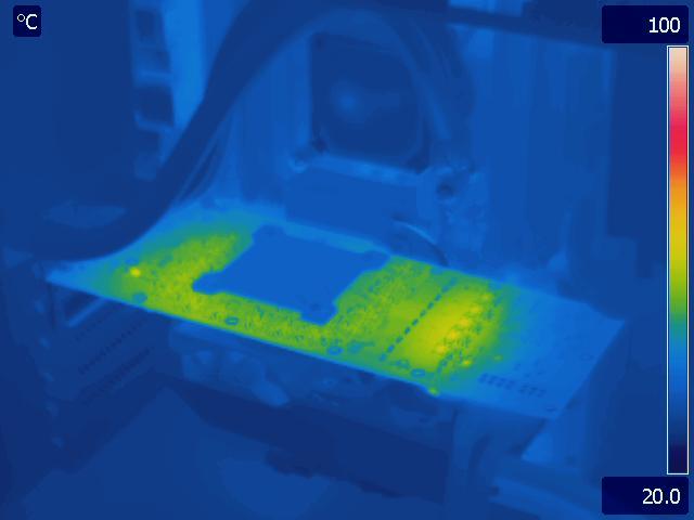 The one concern we still have with the Kraken G10 is how hot the other chips on the card get now that they are not being cooled by the stock heatsink. The Kraken G10 comes with a 80mm fan to help keep those components cool, but we frankly are not sure if the fan alone will be enough without the aid of a heatsink. Unfortunately, while AMD video cards have a couple temperature sensors on the VRM chips that can report temperatures, NVIDIA cards do not. So to get an idea of whether the chips are being adequately cooled or not we decided to use our thermal camera to get a look at the temperatures of the various chips on both video cards.